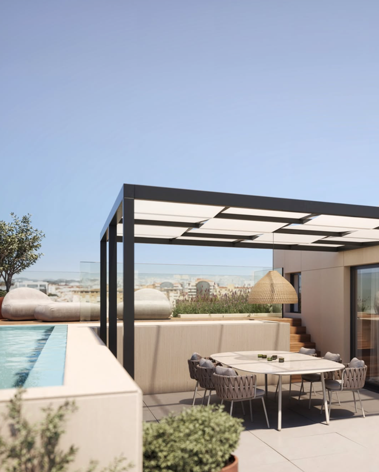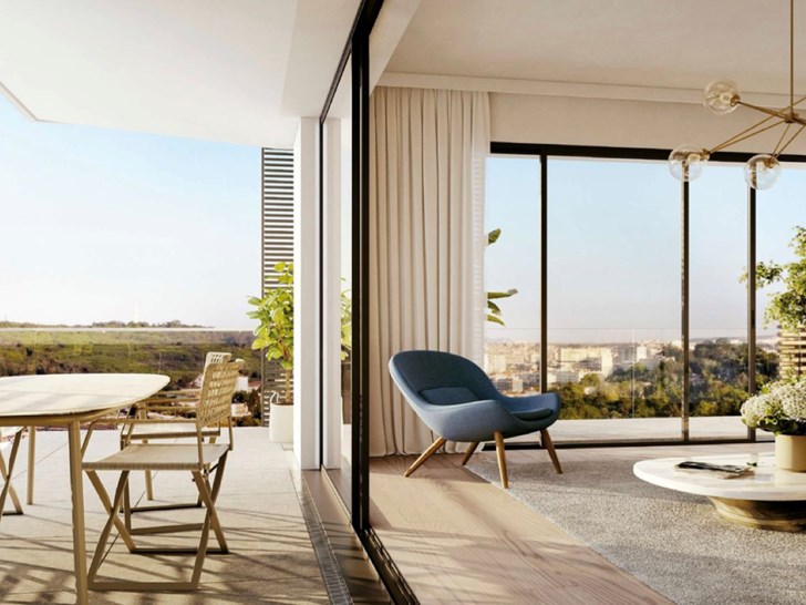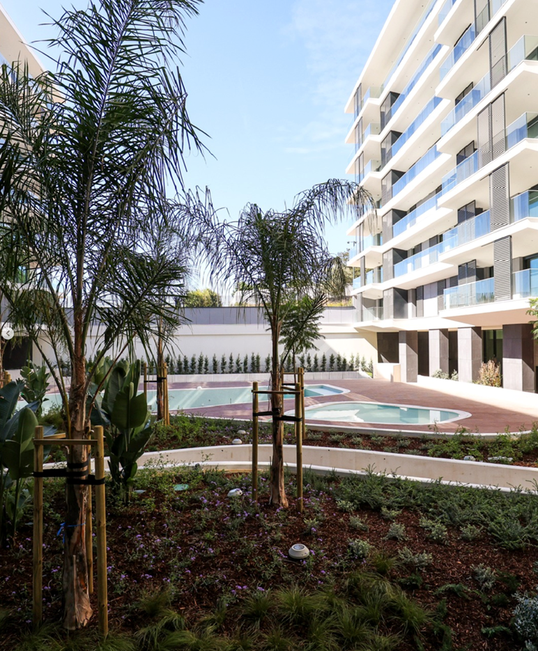 The residential offering includes one to four-bedroom apartments, duplex units, and penthouses. All apartments are spacious and well-proportioned, featuring large windows and generous balconies or terraces. Most units benefit from open views over Lisbon and the Monsanto Green Corridor. Penthouses include private rooftop terraces and swimming pools. The center of the complex provides a shared leisure area for residents.